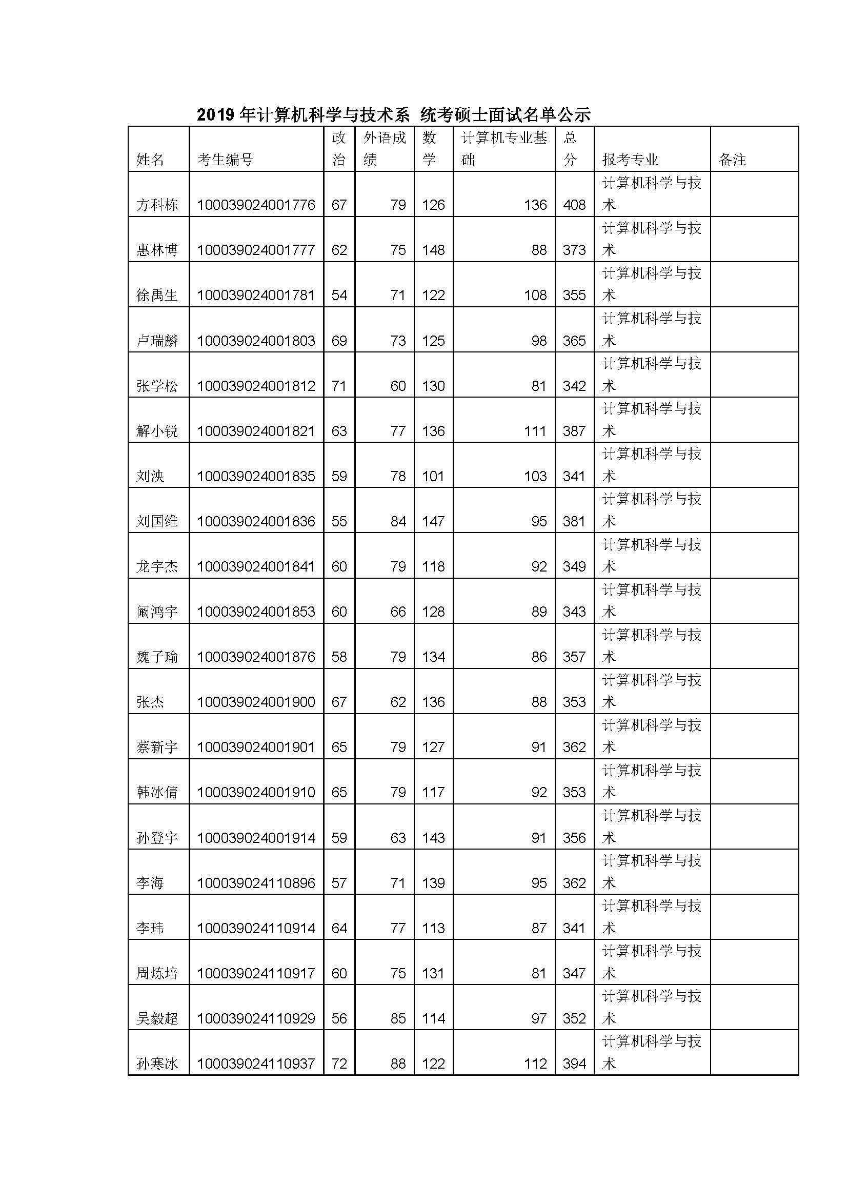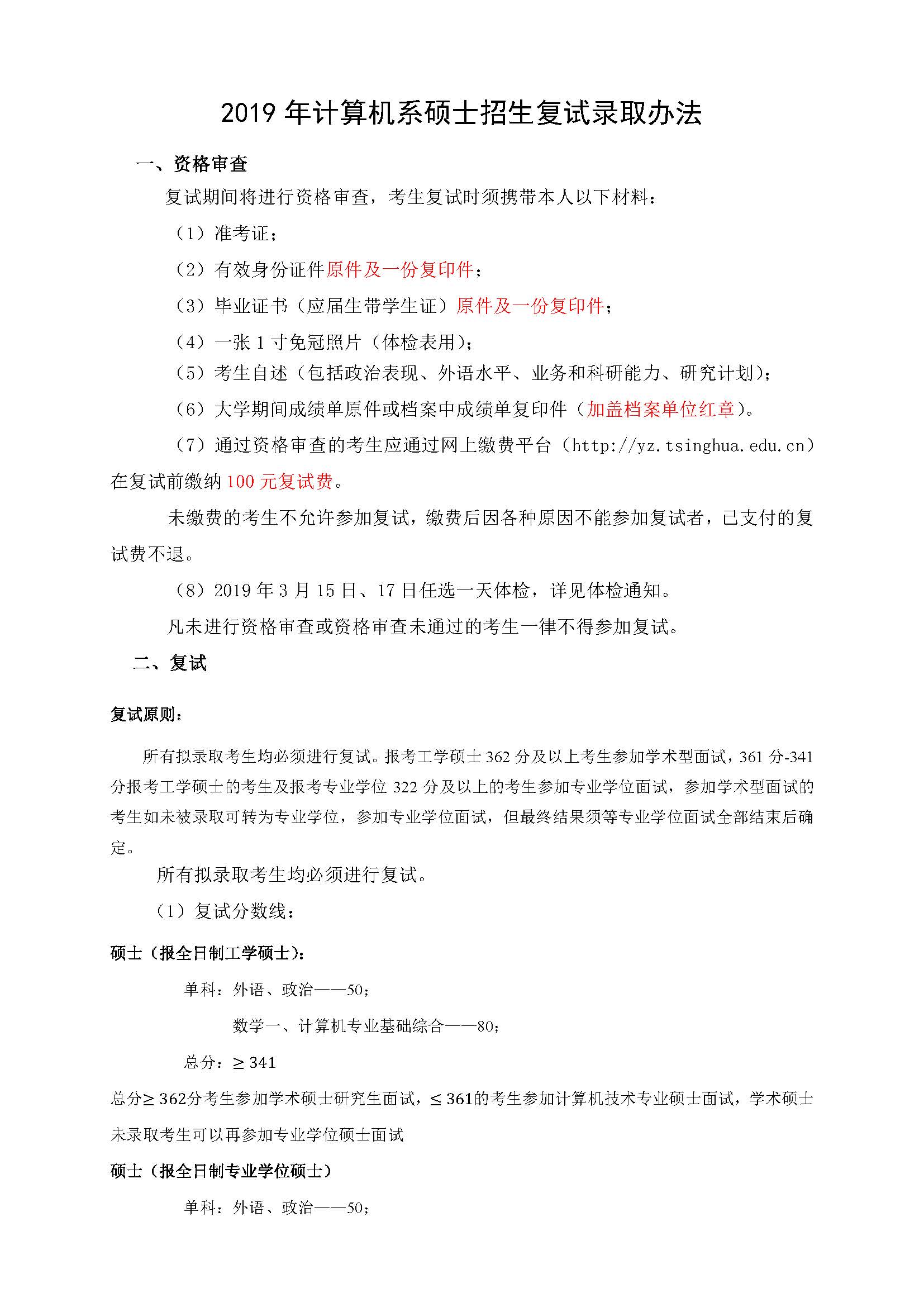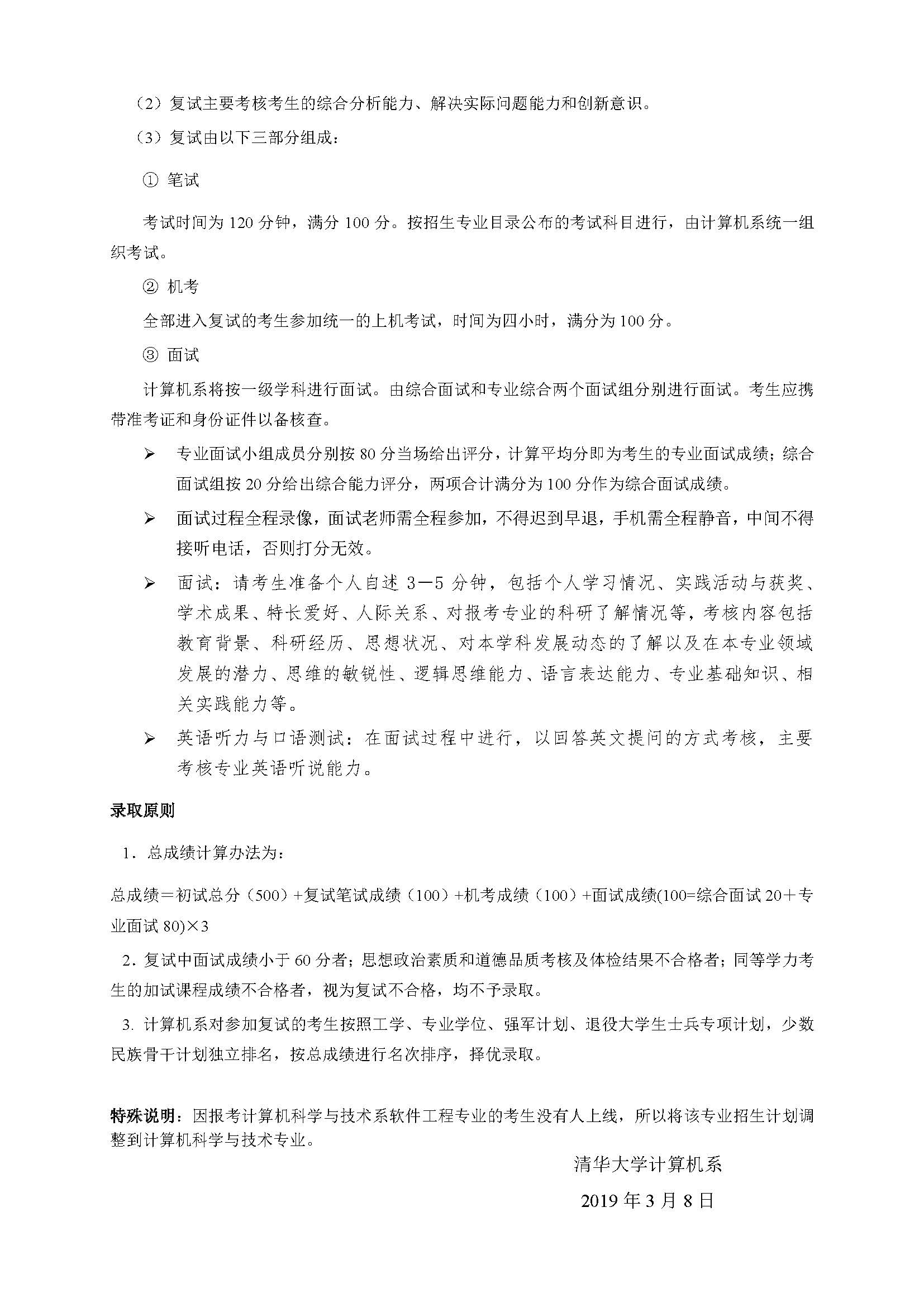 2019年清华大学计算机科学与技术系复试分数线及名单