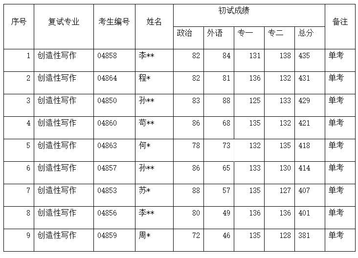 中国人民大学文学院2019年创造性写作专业硕士研究生(单考)单考复试名单