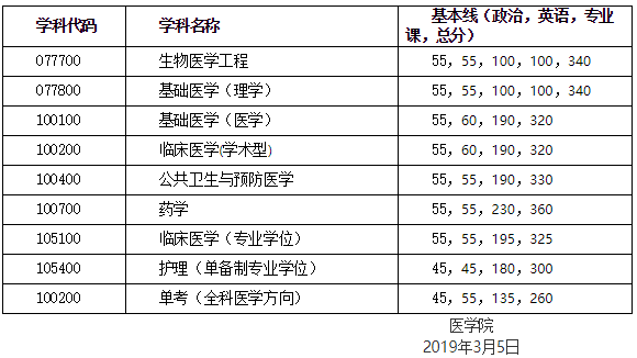 经医学院研究生招生工作领导小组会议讨论决定,2019年医学院硕士研究生入学考试复试分数基本要求如下: