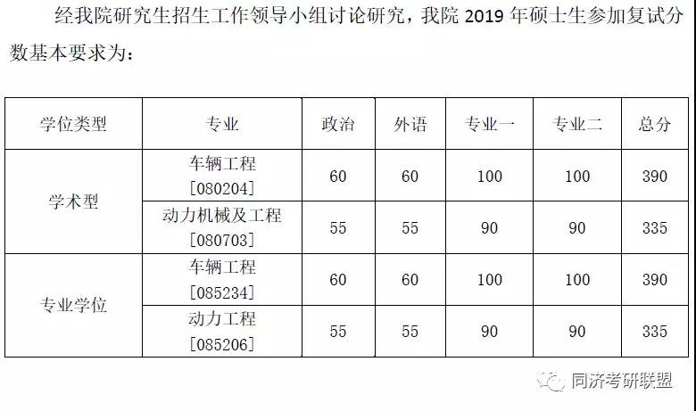 同济大学汽车学院2019年复试分数线