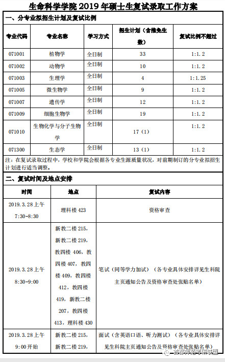 2019年首师大生命科学学院硕士研究生复试录取工作方案