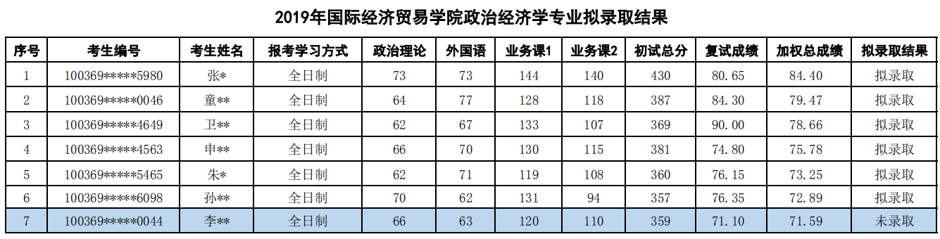 2019年对外经济贸易大学政治经济学专业考研拟录取名单公示