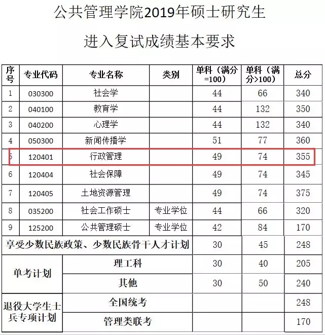 1.统考外语听力成绩合格最低线为16分,专业课笔试成绩合格最低线由公共管理学院划定,面试成绩及格线为120分,以上成绩有一项不符合的均为复试不合格,不予录取。