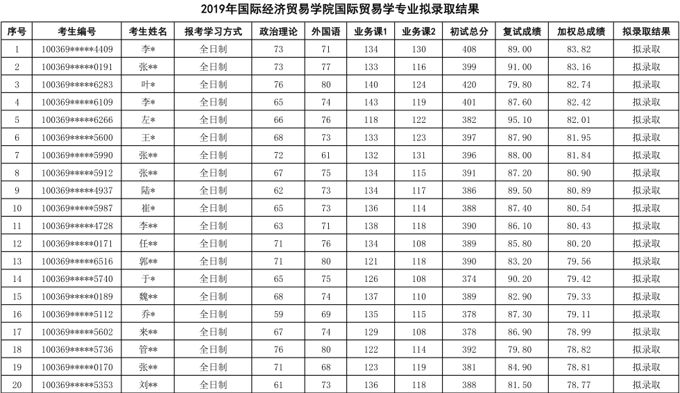 2019年对外经济贸易大学国际贸易学专业硕士研究生拟录取名单