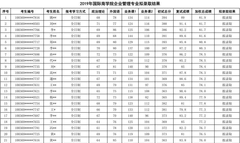 2019年对外经济贸易大学企业管理专业硕士研究生拟录取名单
