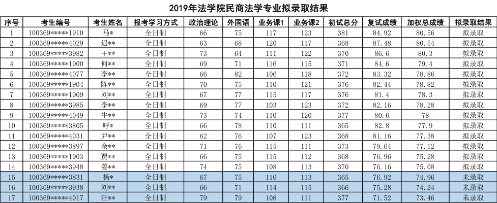 2019年对外经济贸易大学民商法学专业硕士研究生拟录取名单