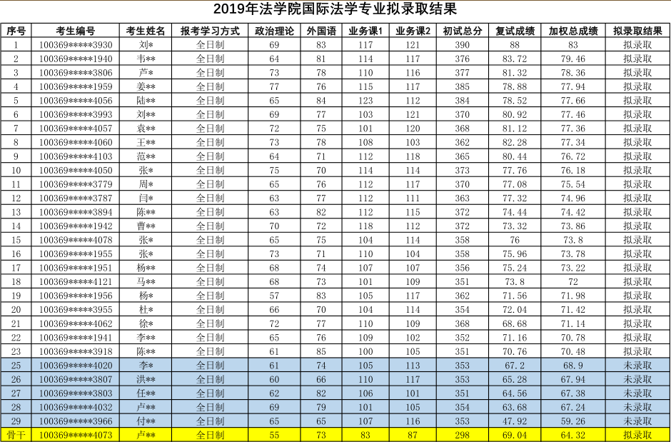 2019年对外经济贸易大学国际法学专业硕士研究生拟录取名单