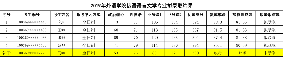 2019年对外经济贸易大学俄语语言文学专业硕士研究生拟录取名单
