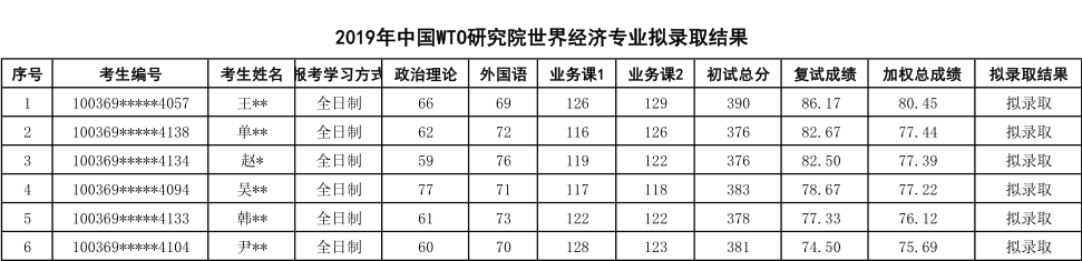 2019年对外经济贸易大学世界经济专业(WTO研究院)硕士研究生拟录取名单