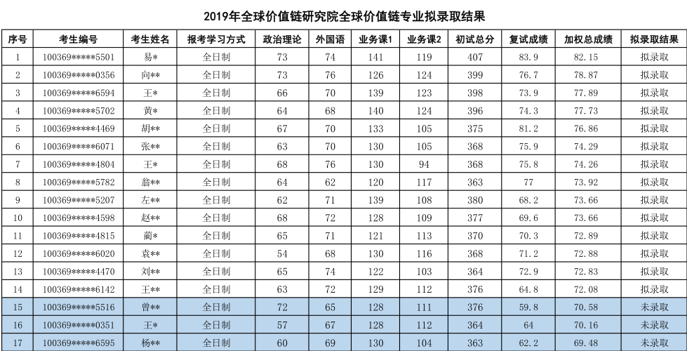 2019年对外经济贸易大学全球价值链专业硕士研究生拟录取名单