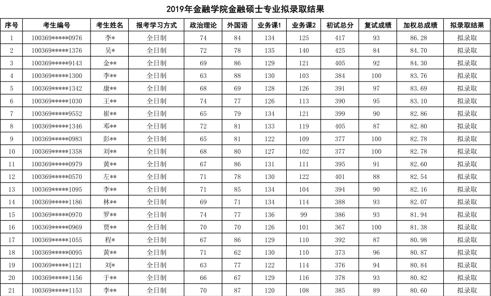 2019年对外经济贸易大学金融硕士(金融院)专业研究生拟录取名单