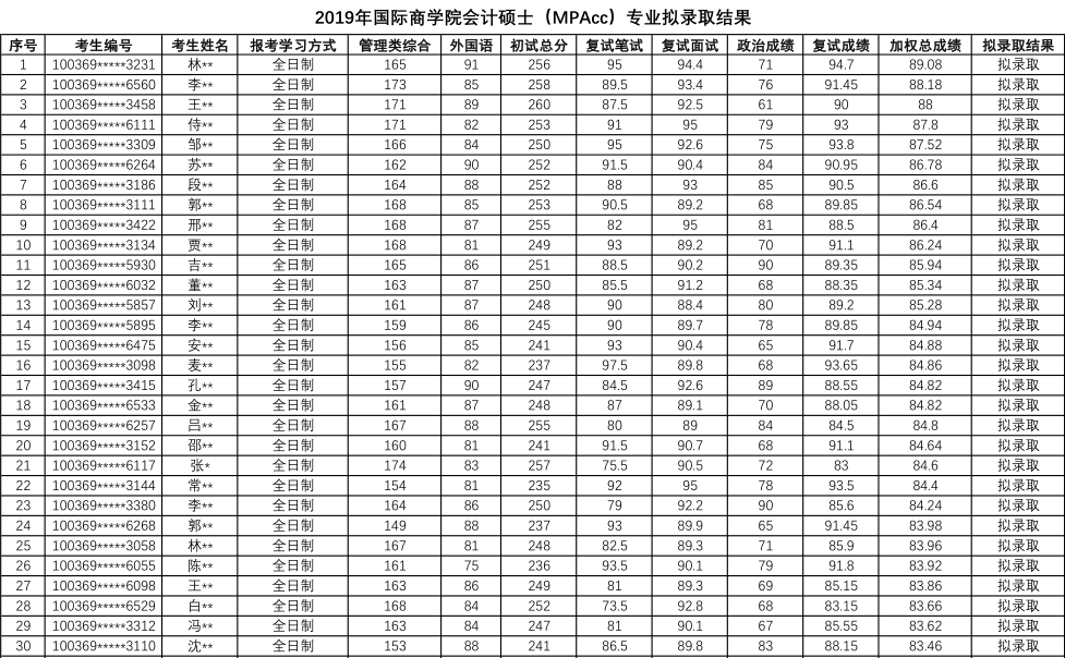 2019年对外经济贸易大学会计硕士(MPAcc全日制)专业研究生拟录取名单