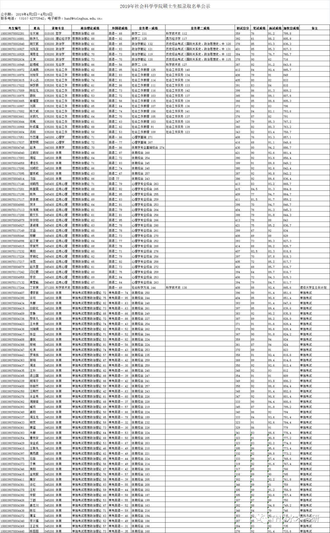 2019年清华大学社会科学学院硕士研究生拟录取名单