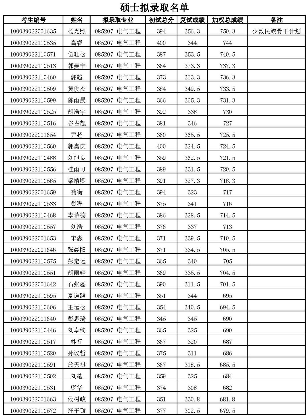 2019年清华大学电机系硕士研究生拟录取名单