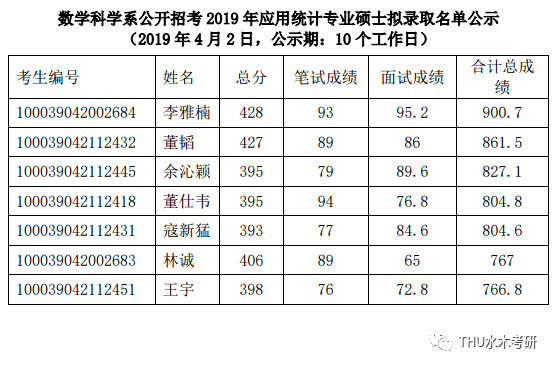 2019年清华大学数学科学学系硕士研究生拟录取名单