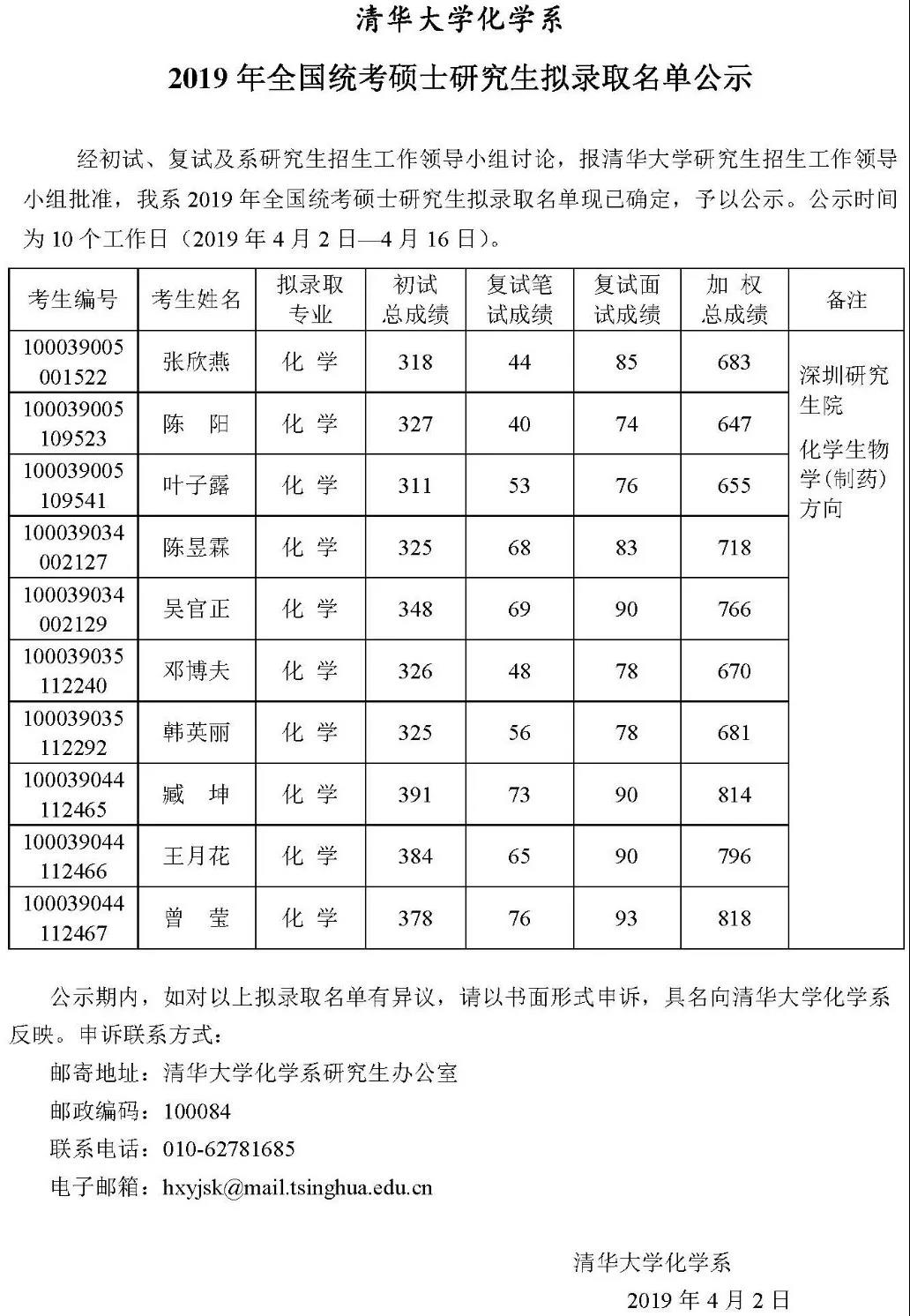 2019年清华大学数学科学学系硕士研究生拟录取名单