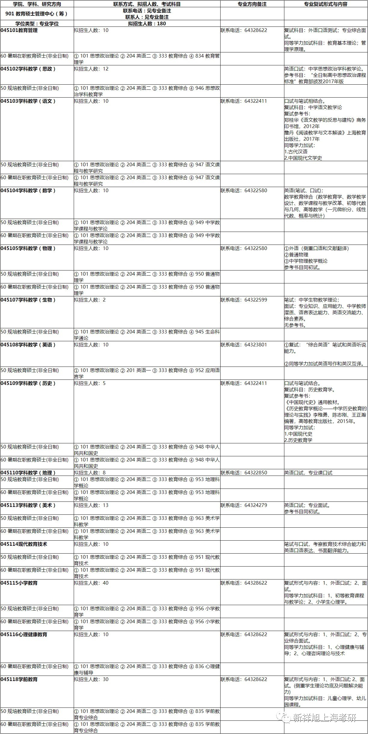 2020年上海师范大学教育硕士管理中心招生专业目录