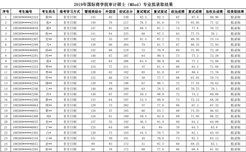 2019年对外经济贸易大学审计硕士(MAud)专业研究生拟录取名单