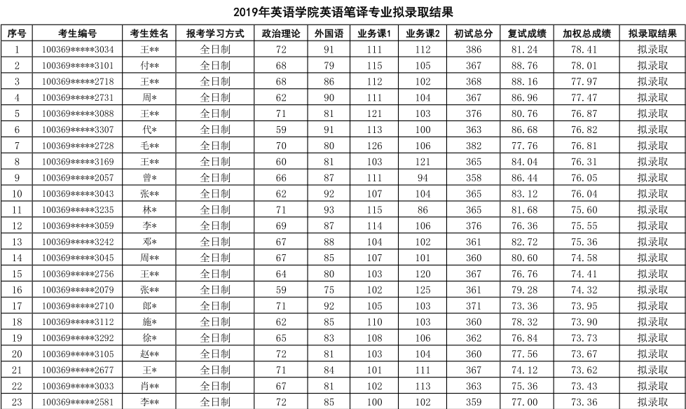 2019年对外经济贸易大学英语笔译专业硕士研究生拟录取名单
