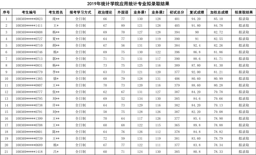 2019年对外经济贸易大学应用统计硕士专业研究生拟录取名单