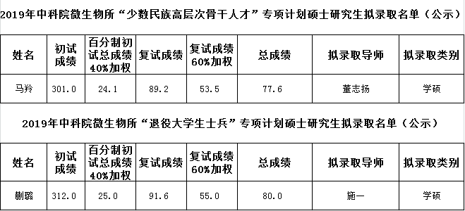 2019年中科院微生物所“少干”及“士兵”专项计划硕士研究生拟录取名单(公示)