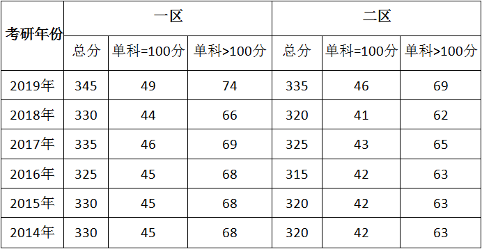 从数据可以看出,近几年,一区的国家线基本稳定在330分左右,但从2017年开始有上涨的趋势,2017年分数线超2016年10分,虽然大家普遍反映2018年的数学题目难度加大,考试成绩不够理想,但2018年的分数线仍为330分,只比2017年低5分,2019年分数线更是出乎很多考研学子的意料,涨到了345分。