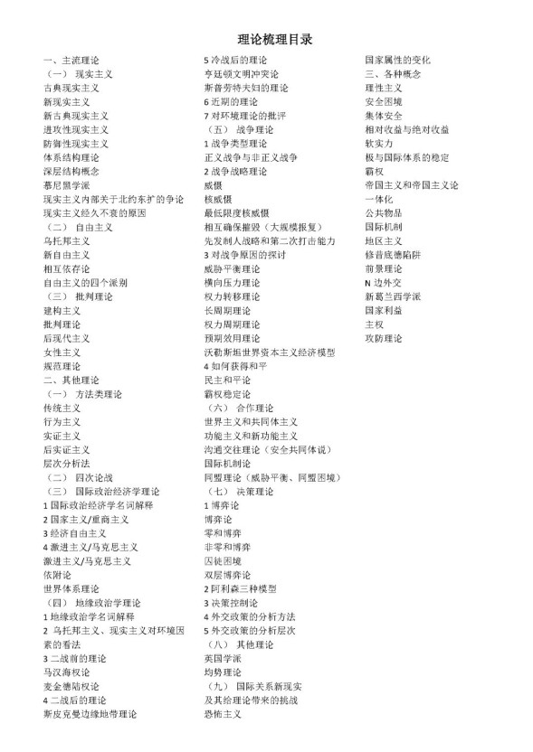 做笔记的方法是《权力制度文化》按理论和方法论来整理;《国际关系学理论与方法》按照各理论流派来写;《国际关系精要》按个人、国家、国际体系等等之类的专题来写,每个专题总结各理论流派的观点;李少军的书不用特别做笔记,比较简单,摘出来能背的内容整理整理就行。