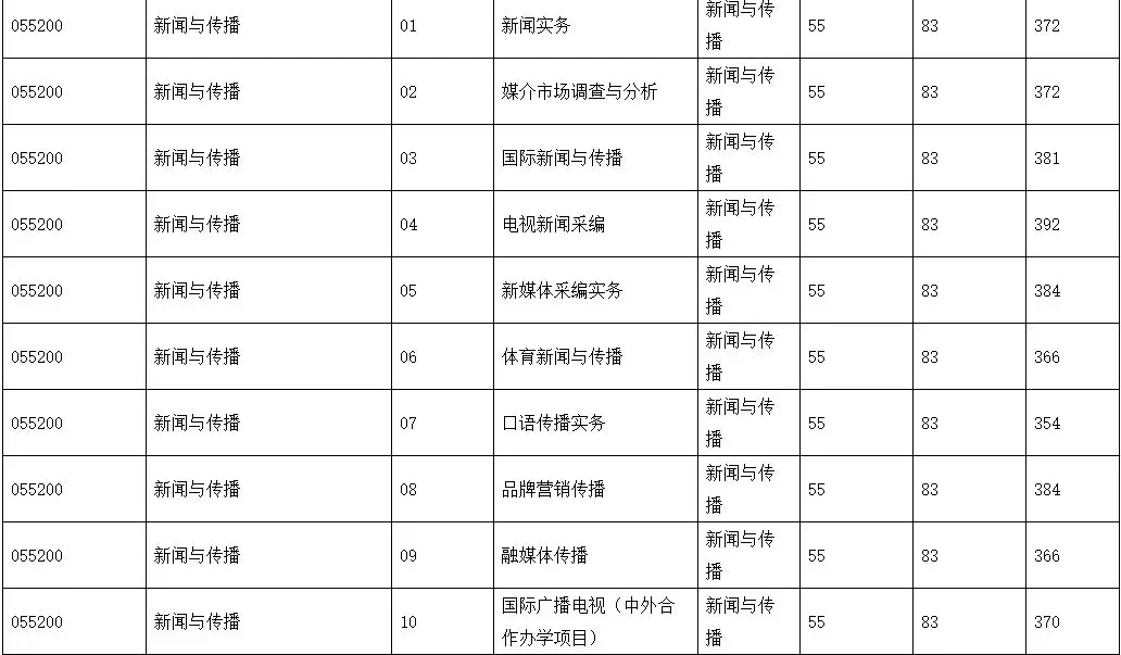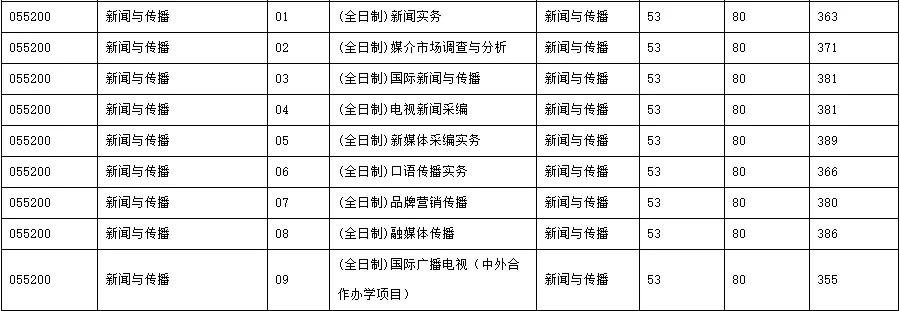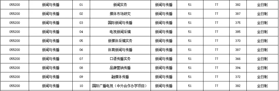 摘要:本文由新祥旭考研吴老师为大家详细解析中国传媒大学新闻与传播专硕考研情况,主要有以下几个板块:中国传媒大学新闻与传播专硕考研考试科目、研究方向介绍、本专业近3年复试分数线对比、本专业近3年报录比情况、本专业考研参考书目、往年录取名单及中国传媒大学备考经验。 一、中国传媒大学新闻与传播考试科目 招生专业:新闻与传播(055200)(专硕) 招生人数:统招40人,推免10人 研究方向: 01新闻实务 02媒体市场研究 03国际新闻与传播 04电视新闻采编 05新媒体采编实务 06体育新闻与传播 07口语传播实务 08品牌营销传播 09融媒体传播 10国际广播电视(中外合作办学项目) 考试科目: ①101 思想政治理论 ②204 英语二或202俄语或203日语 ③334 新闻与传播专业综合能力 ④440 新闻与传播专业基础 注:10方向为中外合作办学项目,报考要求见2018年招生简章。本方向不接收推免生 二、中国传媒大学新闻与传播分数线 2019 2018 2017 三、中国传媒大学新闻与传播考研参考书(仅供参考)