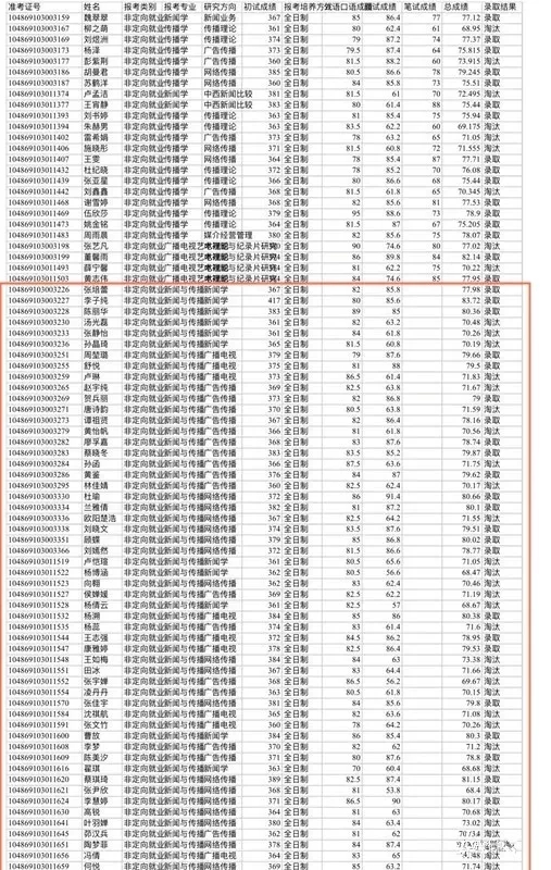 四、2019武汉大学新闻与传播学院复试方案 (一)招生指标情况 新闻与传播专硕全日制总招生人数为56人,拟接收推免生18人,上线考生人数103人,非全日制总招生人数为50人,拟接收推免生0人,上线考生人数0人,复试比例117% (二)复试内容 复试内容及形式:主要考察对专业基础理论、基础知识、基本技能的理解与掌握,考察综合运用所学知识分析问题、解决问题的能力、表达能力、实验技能、计算技能、培养潜力等,并对考生的思想政治素质和品德进行考核。复试方式包括笔试、外语听力口语测试和综合面试,专业硕士没有笔试。 (三)2019新闻与传播复试名单 姓名 报考类别 报考专业 研究方向 初试成绩 报考培养方式 张培蕾 非定向就业 新闻与传播 新闻学 367 全日制 李子纯 非定向就业 新闻与传播 新闻学 417 全日制 陈丽华 非定向就业 新闻与传播 新闻学 383 全日制 汤光磊 非定向就业 新闻与传播 新闻学 361 全日制 张静怡 非定向就业 新闻与传播 新闻学 361 全日制 孙晶琦 非定向就业 新闻与传播 新闻学 365 全日制 周堃璐 非定向就业 新闻与传播 广播电视 379 全日制 舒悦 非定向就业 新闻与传播 广播电视 375 全日制 卢琳 非定向就业 新闻与传播 广播电视 373 全日制 赵宇纯 非定向就业 新闻与传播 广告传播 369 全日制 贺兵丽 非定向就业 新闻与传播 广告传播 373 全日制 唐诗韵 非定向就业 新闻与传播 广告传播 370 全日制 谭祖贤 非定向就业 新闻与传播 广告传播 367 全日制 黄怡帆 非定向就业 新闻与传播 广告传播 366 全日制 廖孚嘉 非定向就业 新闻与传播 广告传播 368 全日制 蔡晓冬 非定向就业 新闻与传播 广告传播 383 全日制 孙函 非定向就业 新闻与传播 广告传播 366 全日制 黄鉴 非定向就业 新闻与传播 广告传播 376 全日制 林佳婧 非定向就业 新闻与传播 广告传播 360 全日制 杜瑜 非定向就业 新闻与传播 网络传播 372 全日制 兰雅倩 非定向就业 新闻与传播 网络传播 382 全日制 欧阳楚浩 非定向就业 新闻与传播 网络传播 367 全日制 刘晓文 非定向就业 新闻与传播 网络传播 374 全日制 顾蝶 非定向就业 新闻与传播 网络传播 379 全日制 刘嫣然 非定向就业 新闻与传播 网络传播 372 全日制 卢恺瑄 非定向就业 新闻与传播 新闻学 361 全日制 杨博涵 非定向就业 新闻与传播 新闻学 362 全日制 向翱 非定向就业 新闻与传播 网络传播 362 全日制 侯婵媛 非定向就业 新闻与传播 广告传播 369 全日制 杨倩云 非定向就业 新闻与传播 新闻学 361 全日制 杨溯 非定向就业 新闻与传播 广播电视 384 全日制 杨蕊 非定向就业 新闻与传播 广告传播 374 全日制 王志强 非定向就业 新闻与传播 广播电视 372 全日制 康雅婷 非定向就业 新闻与传播 广播电视 378 全日制 王如梅 非定向就业 新闻与传播 网络传播 384 全日制 田冰 非定向就业 新闻与传播 网络传播 367 全日制 张宇婵 非定向就业 新闻与传播 广告传播 368 全日制 凌丹丹 非定向就业 新闻与传播 广告传播 363 全日制 张佳宇 非定向就业 新闻与传播 网络传播 381 全日制 沈祺航 非定向就业 新闻与传播 广播电视 365 全日制 张文竹 非定向就业 新闻与传播 广播电视 360 全日制 曹放 非定向就业 新闻与传播 新闻学 384 全日制 李梦 非定向就业 新闻与传播 广告传播 370 全日制 陈美汐 非定向就业 新闻与传播 广告传播 371 全日制 翟琪 非定向就业 新闻与传播 新闻学 363 全日制 蔡琪琦 非定向就业 新闻与传播 网络传播 389 全日制 张尹欣 非定向就业 新闻与传播 网络传播 368 全日制 李慧婷 非定向就业 新闻与传播 网络传播 371 全日制 高锐 非定向就业 新闻与传播 网络传播 364 全日制 叶羽婵 非定向就业 新闻与传播 网络传播 380 全日制 茆汉兵 非定向就业 新闻与传播 广告传播 362 全日制 陶梦菲 非定向就业 新闻与传播 网络传播 378 全日制 冯倩 非定向就业 新闻与传播 广播电视 364 全日制 何悦 非定向就业 新闻与传播 网络传播 369 全日制 彭佳 非定向就业 新闻与传播 广告传播 378 全日制 廖渊 非定向就业 新闻与传播 网络传播 363 全日制 桂伟钦 非定向就业 新闻与传播 新闻学 376 全日制 宋琪琪 非定向就业 新闻与传播 广告传播 362 全日制 杜冰莹 非定向就业 新闻与传播 广播电视 370 全日制 李泽坤 非定向就业 新闻与传播 网络传播 366 全日制 葛莹莹 非定向就业 新闻与传播 网络传播 387 全日制 苗坷 非定向就业 新闻与传播 广告传播 365 全日制 王庆雅 非定向就业 新闻与传播 网络传播 367 全日制 张乐 非定向就业 新闻与传播 网络传播 381 全日制 黄慧慧 非定向就业 新闻与传播 广告传播 371 全日制 方芳 非定向就业 新闻与传播 广告传播 370 全日制 许宗倩 非定向就业 新闻与传播 新闻学 384 全日制 肖田田 非定向就业 新闻与传播 广告传播 378 全日制 刘静怡 非定向就业 新闻与传播 网络传播 364 全日制 周易 非定向就业 新闻与传播 网络传播 362 全日制 常玲爽 非定向就业 新闻与传播 新闻学 364 全日制 杜书 非定向就业 新闻与传播 广告传播 379 全日制 夏伟超 非定向就业 新闻与传播 网络传播 364 全日制 许海潮 非定向就业 新闻与传播 网络传播 380 全日制 孙子源 非定向就业 新闻与传播 网络传播 385 全日制 喻凡 非定向就业 新闻与传播 网络传播 362 全日制 陈小鱼 非定向就业 新闻与传播 网络传播 368 全日