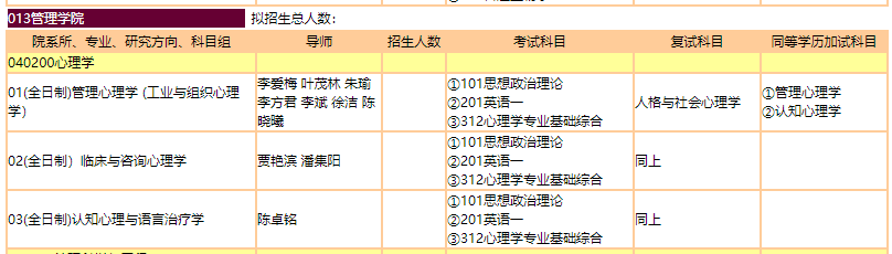 01(全日制)管理心理学 (工业与组织心理学)导师:李爱梅 叶茂林 朱瑜 李方君 李斌 徐洁 陈晓曦