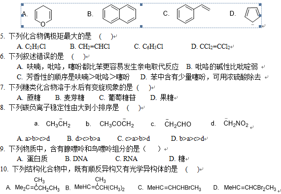 本卷满分300分,由有机化学(150分)和生物化学(150分)两部分组成。 第一部分:有机化学(150分) 一、选择题(含多选题)(20小题,每小题3分,共60分) 1. 甲苯进行Friedel-Crafts反应时,应选择下列哪个作为溶剂 ( ) A. 苯甲醚 B. 硝基苯 C. 溴苯 D. 苯胺 2. HCN不与烯烃的双键加成的原因是 ( ) A. 它是亲核试剂 B. 它是弱酸 C. 它是亲电试剂 D. 含有不饱和健 3. 下列化合物酸性最强的是 ( ) A. 苯甲酸 B. 苯酚 C. 对硝基苯甲酸 D. 对硝基苯酚 4. 下列化合物属于非苯芳烃的是 ( )