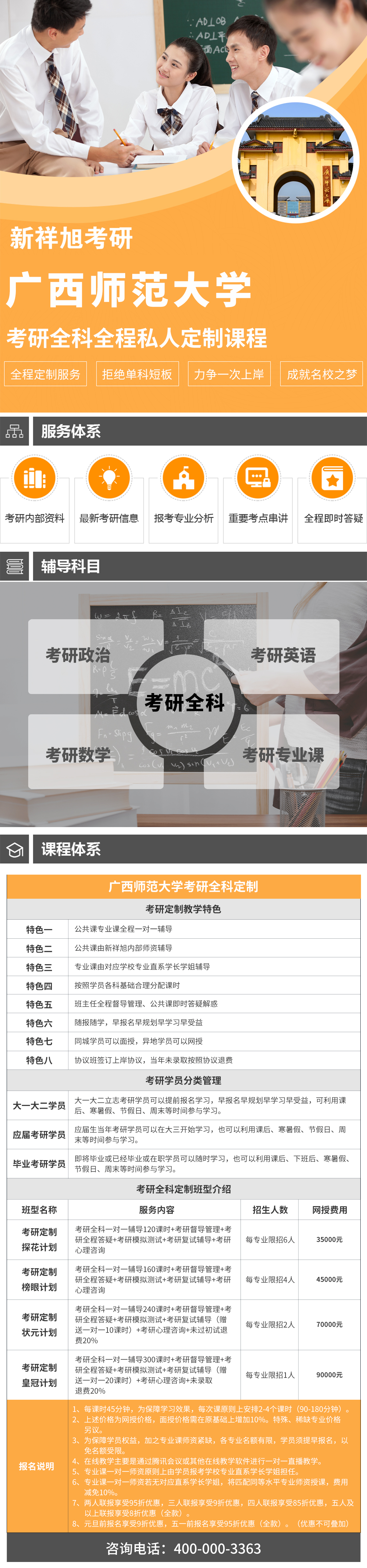 课程描述:新祥旭考研专注广西师范大学考研全科定制辅导,以效果为导向,以上岸为目标,为广大考研学生提供个性化、定制化、多对一的考研全科全程辅导,考研公共课和考研专业课皆为一对一辅导,全国各地考研学生可以面授也可以网授,力争让考研学生顺利考取广西师范大学攻读硕士研究生。