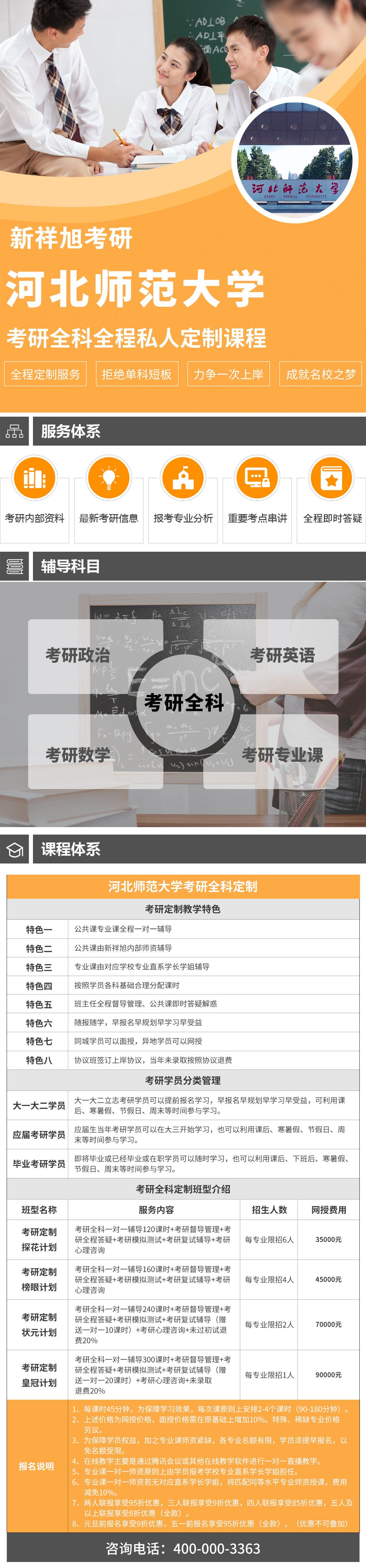 课程描述:新祥旭考研专注河北师范大学考研全科定制辅导,以效果为导向,以上岸为目标,为广大考研学生提供个性化、定制化、多对一的考研全科全程辅导,考研公共课和考研专业课皆为一对一辅导,全国各地考研学生可以面授也可以网授,力争让考研学生顺利考取河北师范大学攻读硕士研究生。